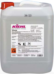 Vinox Kantinler ve yemek fabrikaları için kireç ve yağ temizleyici Özellikleri : Paslanma korumalı, son derece aktif asit bazlı temizleyici. Boya ve esans içermez. Kireçtaşı birikintileri, su kaynaklı kireç ve hayvansal ya da nebati kökenli içyağı ve yağları yok eder. Vinox kokusuz bir üründür ve az köpürdüğü için döner başlıklı makinelerle kullanılabilir. Ürünün asitlere duyarlı yüzeylerde kullanımı, materyali geri dönüşsüz bir şekilde zedeleyecektir. İçindekiler : Non-iyonik yüzey etkin maddeler 5-15 %, inorganik asitler, paslanma önleyiciler. pH-değeri (konsantre): yaklaşık 0,5 pH-değeri (kullanıma hazır solüsyon): yaklaşık 1,5 Kullanım Alanları : Özellikle mutfak ve gıda işleme alanlarındaki seramik duvar, yer karoları, güvenlik karoları, çalışma tezgahları ve paslanmaz çelikten yapılmış tank benzeri tüm asitlere ve suya dayanıklı yüzeyler ve objelerde kullanıma uygundur. Suya ve asitlere dayanıklı zemin kaplamalarındaki çimento kalıntılarını yok etmek için de kullanılabilir. Bitiştirilmiş yüzeyler ve objeler muhafaza edilmelidir. Kullanım Şekli : Derinlemesine temizlik: Kirlerin yoğunluğuna göre 1 litre Vinox'u 2-8 litre soğuk suyla seyreltin. Temizlenecek alanı önce temiz suyla ıslatın. Daha sonra solüsyonu zemine yayın, döner başlıklı makine ve fırçayla çalışın. Bir müddet etki etmesini bekledikten sonra suyla iyice durulayın Yüzey temizliği: Kirlerin yoğunluğuna göre 0,5 litre Vinox'u 5-8 litre soğuk suyla seyreltin. Solüsyonu sprey kutusuna koyun ve yüzeye sıkın. Bir müddet etki etmesini bekledikten sonra suyla iyice durulayın. Bitiştirilmiş, asitlere duyarlı yüzeylerde kullanırken dikkatli olun ve mümkünse böyle yüzeyleri önceden korumaya alın. Vinox, fazla köpürmediği için köpük üniteleri ile de kullanılabilir. Uyarı: Kiehl ürünün usule uygun olmayan kullanımı ve bundan doğacak zararlar için hiçbir sorumluluğu kabul etmez.