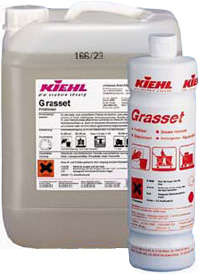 Grasset Yağ giderici Özellikleri : Yağ, içyağı ve nebati ya da hayvansal albümin birikintilerini yok etmek için dizayn edilmiş, alkali ve hızlı tesirli deterjan. Grasset hem soğuk hem de sıcak suyla kullanılabilir ve iyi bir paslanma koruması sağlar. Ürün, gıda bulundurulan alanların temizliği için uygun olan maddeler içerir. İçindekiler : Aniyonik yüzey etkin maddeler, non-iyonik yüzey etkin maddeler, sabun < 5%, suda çözünebilen solventler, fosfatlar < 5%, alkaliler. pH-değeri (konsantre): yaklaşık 13 pH-değeri (kullanıma hazır solüsyon): yaklaşık 11 Kullanım Alanları : Kantin, kasap dükkanları ve mezbahalar, mandıralar, peynir mandıraları, ekmek fırınları, hastaneler ve oteller gibi gıda işleme alanlarının suya ve alkalilere dayanıklı duvar ve yer zeminlerinin temizliğinde kullanıma uygundur. Köpük yapıcı makineler için de uygundur. Paslanma koruması sayesinde Grasset, anotlu alüminyum üzerinde de kullanılabilir. Linolyum ve su çözeltili vernik benzeri alkalilere duyarlı yüzeylerde kullanıma uygun değildir. Kullanım Şekli : İlk uygulamadan önce küçük bir bölgeyi materyalin alkali direncini öğrenmek için test edin. Derinlemesine temizlik: 8 litre suya 1 litre katın, döner başlıklı makine ile temizleyin ve vakumlayın. Köpüklü temizlik : Konteynırı seyreltilmemiş ürünle doldurun. Kirlerin yoğunluğuna göre, meme ayarını 1:4 ila 1:10 şeklinde yapın. Yüzeyi köpüklendirin. 10 dakika etki etmesini bekledikten sonra temiz suyla durulayın. İnatçı kirlerin temizliği : Grasset'i seyreltmeden sprey şişesinden kullanın. Gıda maddeleriyle doğrudan temas eden çalışma alanları ve mutfak tezgahları musluk suyu ile iyice temizlenmelidir. İnatçı yağ birikimi durumlarında, sıcak su (40°-60° C civarında) Grasset'in etkisini hızlandırır. Yağ ve albümin birikmelerinde Grasset'i ilk önce soğuk suyla tavsiye edilen şekilde solüsyon haline getirerek kullanın. Daha sonra, zemini döner başlıklı makinenin tankından alacağınız sıcak su ile ovarak temizleyin.